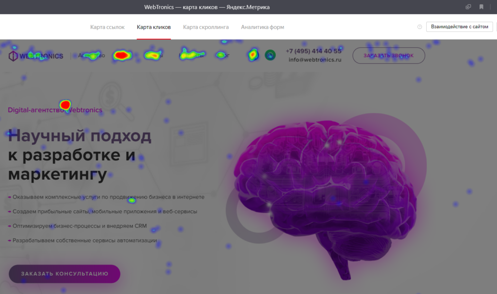 Пример карты кликов на сайте Webtronics (инструмент «Яндекс.Метрика»)